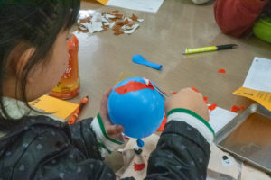 新聞紙を貼って、乾かして、色をつけて…。
